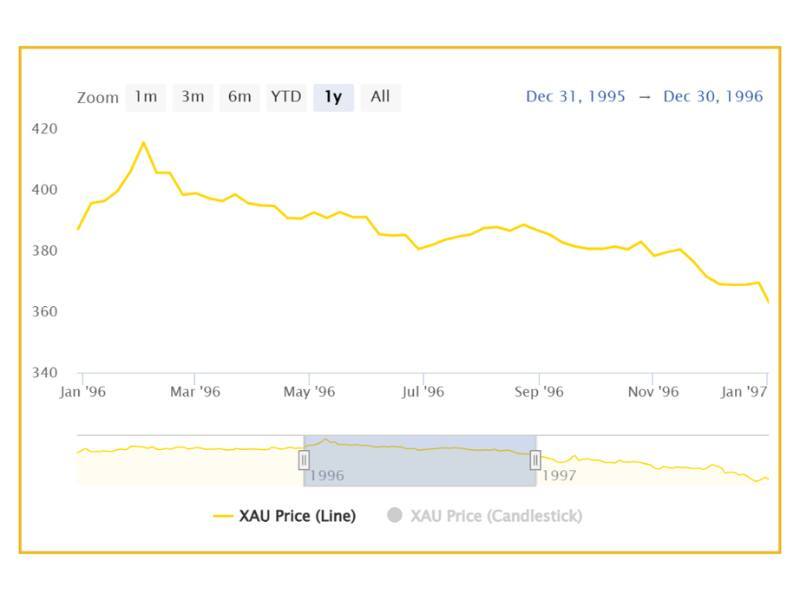 Nửa đầu thập niên 1990 chứng kiến sự phục hồi mạnh mẽ của Mỹ và EU. USD tăng giá kéo theo nhu cầu trú ẩn vàng giảm, khiến giá vàng nằm trong vùng thấp.