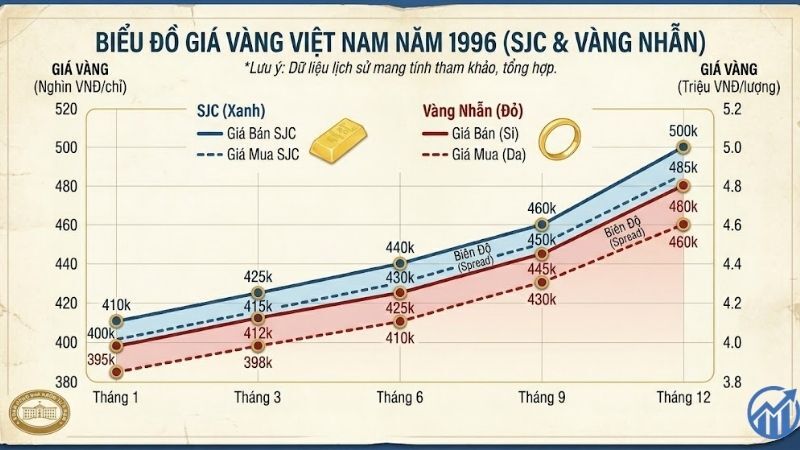 Giá vàng năm 1996 tại Việt Nam ghi nhận mức mua vào khoảng 430.000 đồng/chỉ, trong khi giá bán ra dao động quanh 500.000 đồng/chỉ. Đây là mức giá khá ổn định và không có biến động mạnh, trái ngược hoàn toàn với các giai đoạn vàng tăng vọt sau này.