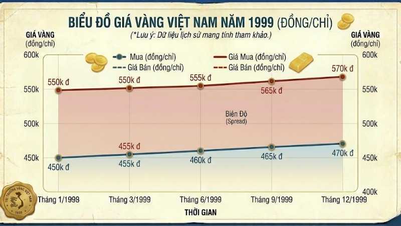 Vào năm 1999, giá vàng tại Việt Nam mua vào dao động từ 450.000 đồng/chỉ đến 460.000 đồng/chỉ, và giá bán ra dao động từ 550.000 đồng/chỉ đến 560.000 đồng/chỉ.