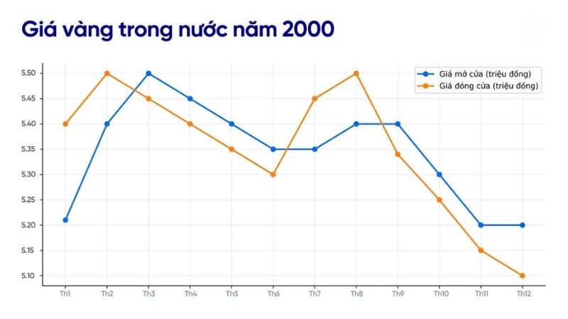 Vào năm 2000, giá vàng tại Việt Nam biến động nhẹ và duy trì ở mức thấp kỷ lục so với hiện nay. Cụ thể: