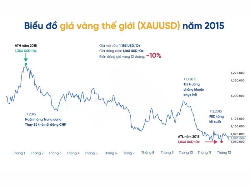 Tuy nhiên, xu hướng giảm giá kéo dài suốt cả năm. Đến cuối năm 2015, giá vàng đóng cửa ở mức 1,061.3 USD/ounce, giảm khoảng 10% so với đầu năm.