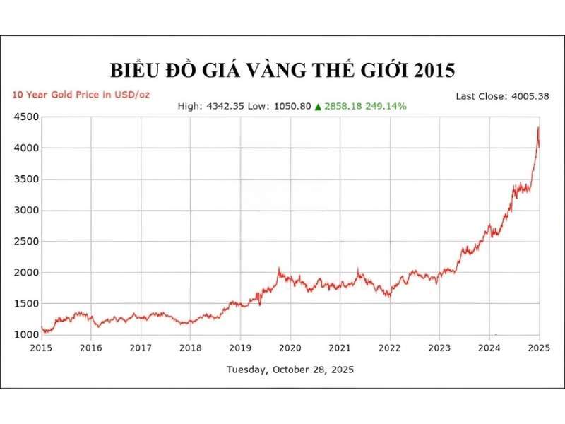 Giá vàng năm 2015 là một năm đầy biến động, với xu hướng giảm do ảnh hưởng của chính sách tiền tệ của FED, sự phục hồi của nền kinh tế toàn cầu, và sự mạnh lên của đồng USD. Tuy nhiên, vàng vẫn giữ được vị trí quan trọng là kênh trú ẩn an toàn trong những thời điểm bất ổn kinh tế. Việc theo dõi giá vàng trong năm 2015 giúp nhà đầu tư nhận thức rõ hơn về các yếu tố tác động lên giá vàng và xây dựng chiến lược đầu tư phù hợp trong tương lai.