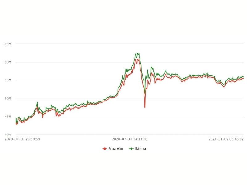Cuối năm 2020: Giá vàng SJC đã đạt mức 55,55 triệu đồng/lượng (mua vào) và 56,12 triệu đồng/lượng (bán ra), tức là tăng khoảng 12,97 triệu đồng/lượng ở chiều mua vào và 13,35 triệu đồng/lượng ở chiều bán ra, tương ứng với mức tăng trưởng 30,7% và 31,12% trong cả năm.