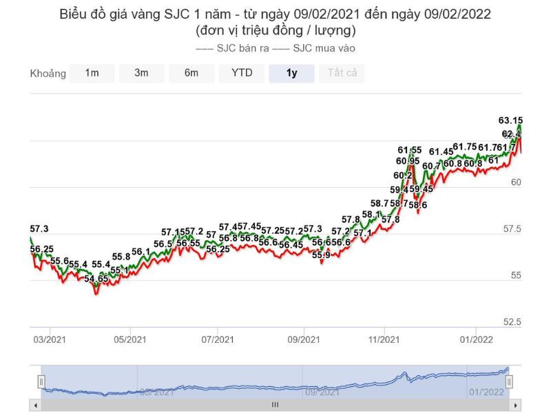Tháng 3/2022: Giá vàng có sự tăng mạnh lên mức 62 - 63 triệu đồng/lượng, đạt mức cao nhất trong năm do ảnh hưởng của cuộc xung đột Nga - Ukraine.